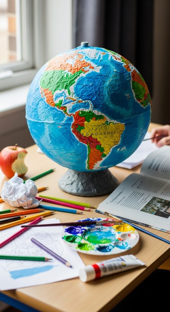 Inflate a balloon, cover it with newspaper and glue, then paint it as a colorful globe for geography projects.