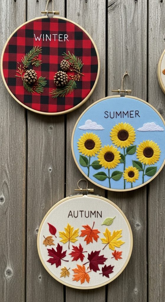 Press real or faux leaves and flowers between layers of clear fabric or tulle stretched inside a hoop. This nature-inspired craft looks delicate and artistic, ideal for garden-themed or eco-style décor.