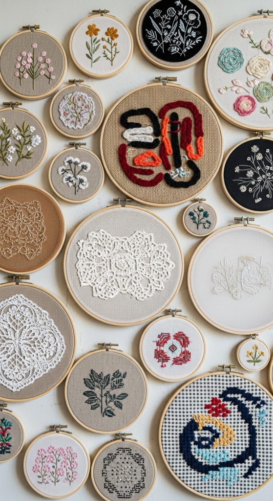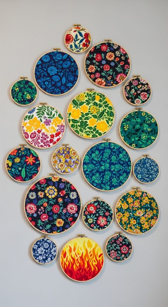 Hang multiple embroidery hoops of different sizes with different fabrics or patterns to create a gallery-style wall.