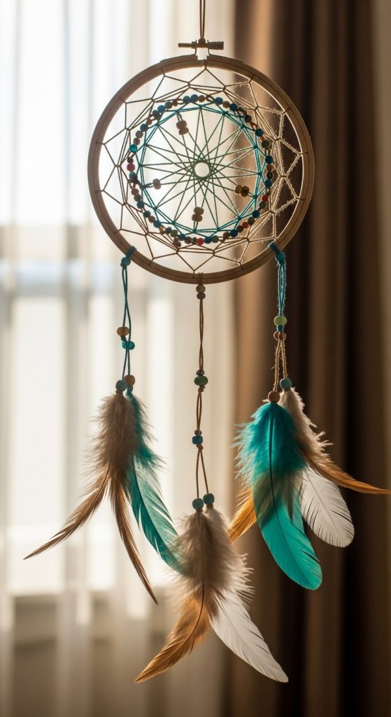 Turn the hoop into a dreamcatcher by weaving threads in patterns and adding feathers and beads.