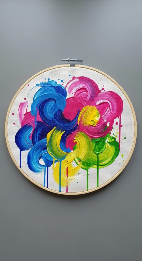 Instead of fabric, paint a design directly on canvas or cloth stretched in the hoop. Abstract art, quotes, or simple shapes look great.