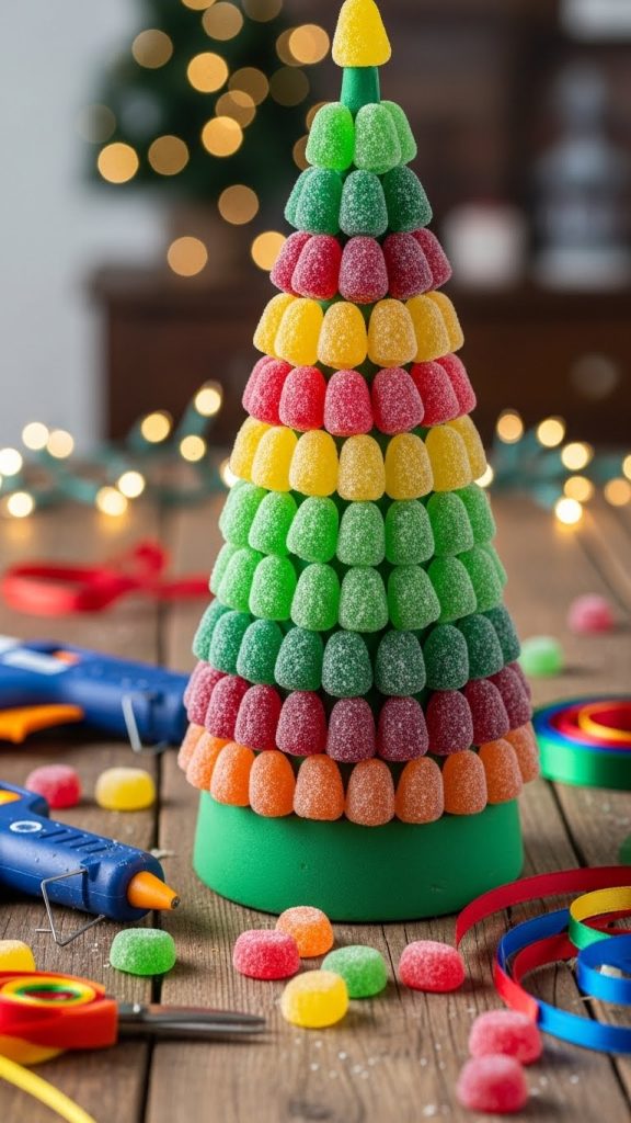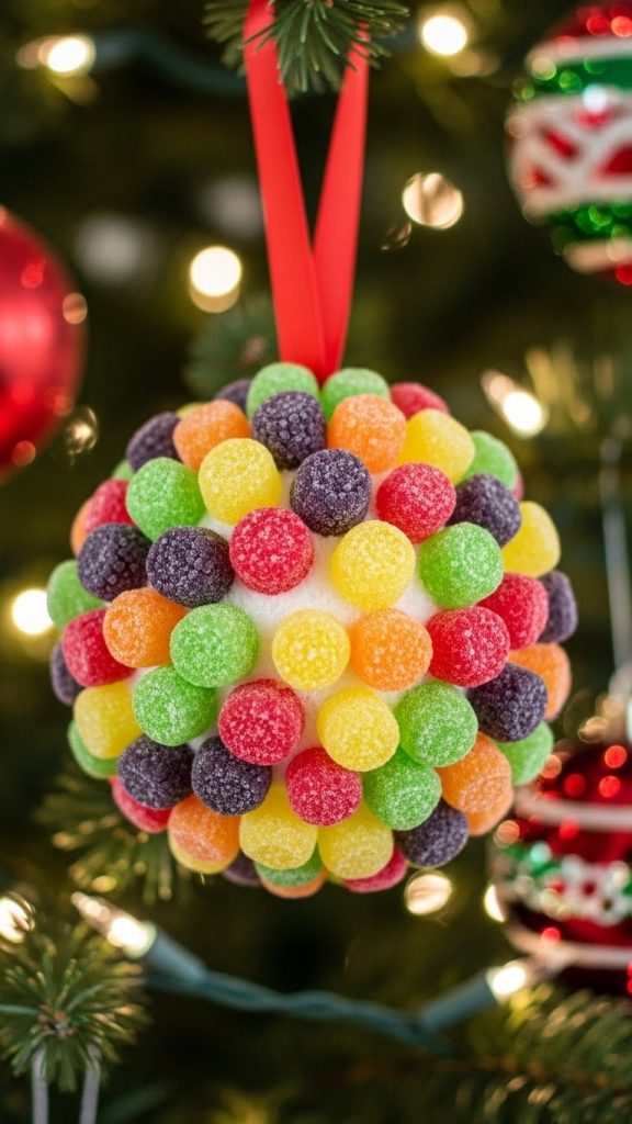 Glue or toothpick gumdrops onto a foam ball until fully covered. Insert a ribbon loop at the top to create hanging ornaments. These look adorable on Christmas trees, candy-land displays, or gift baskets. You can also experiment with stripes, spirals, or solid-color ombré patterns.
