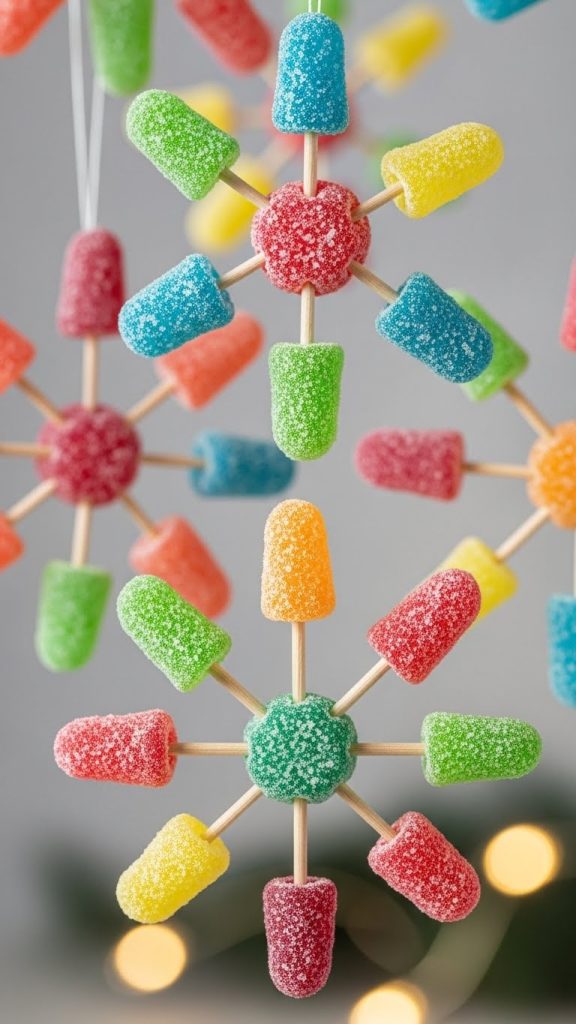 Create gorgeous gumdrop snowflakes using toothpicks as the structural “arms.” Connect gumdrops on the ends of each toothpick and build symmetrical snowflakes. These look stunning as hanging decorations, window displays, or classroom crafts. Add clear glitter glue if you want them extra sparkly.