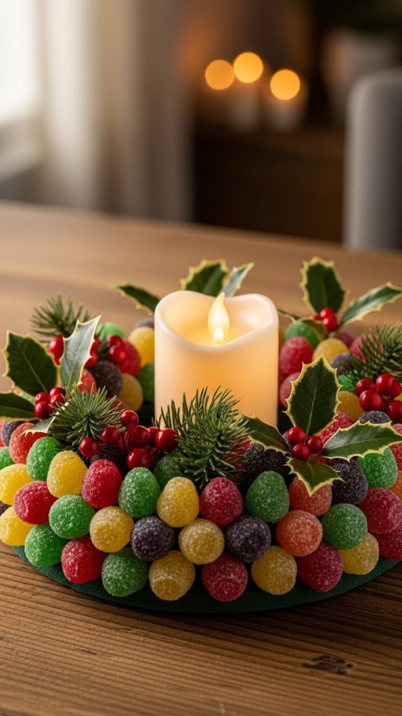 Using a foam wreath form, attach gumdrops around the ring in thick, even rows. Add greenery, ribbon, and a candle in the center (LED recommended). This creates a bright, candy-inspired table centerpiece perfect for holiday dinners or winter parties.