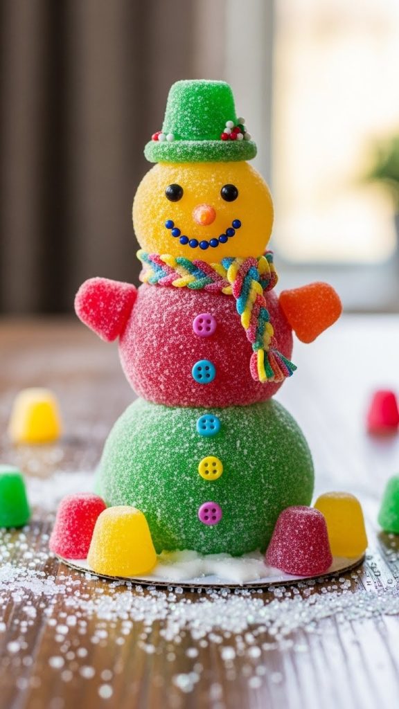 Stack gumdrops onto a toothpick or skewer to build mini snowmen. Use tiny peppercorns or sprinkles for eyes/buttons and a small piece of orange candy for the nose. Add a scarf made from licorice strings. These adorable snowmen are perfect for classroom crafts or edible displays at holiday parties.