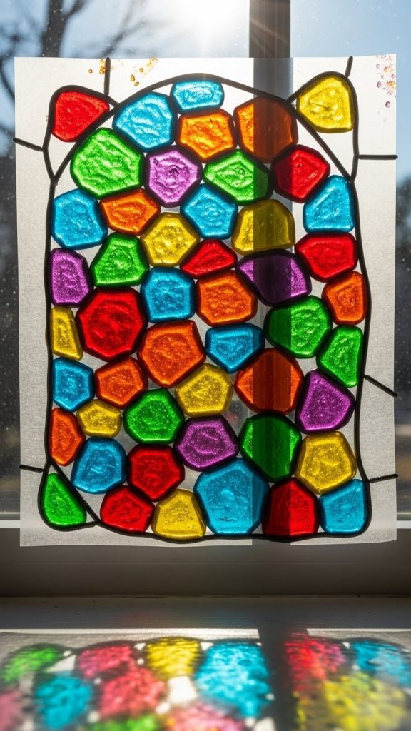Flatten gumdrops (lightly warmed in the microwave for a few seconds) and press them onto wax paper in patterns. Hold the artwork up to the window to see the “stained glass” effect. This is a fun, colorful craft for kids and adds a whimsical winter vibe to classrooms.