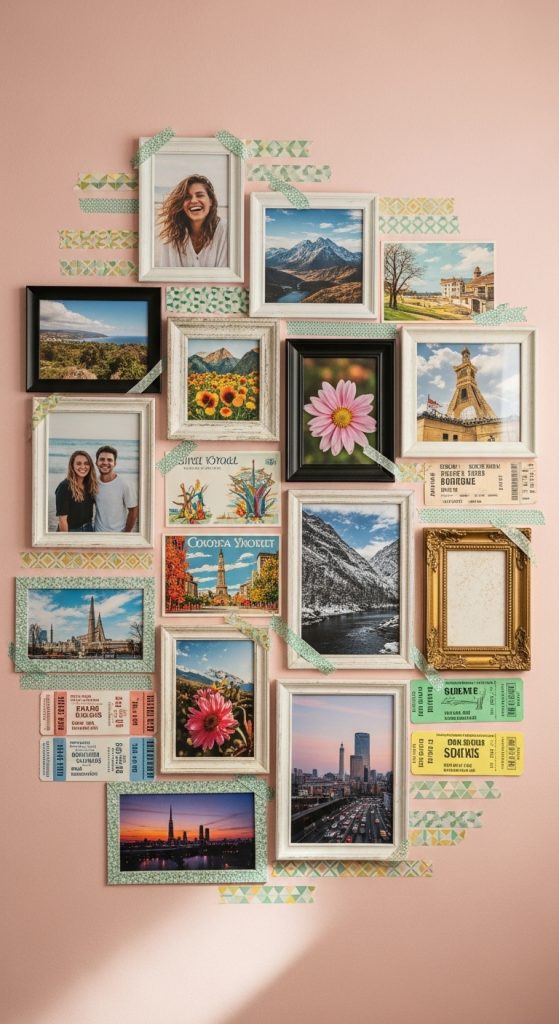 Washi tape is a renter-friendly way to create frames or grids for photos. Mix personal memories with printable art.