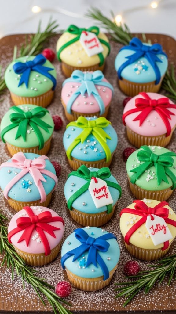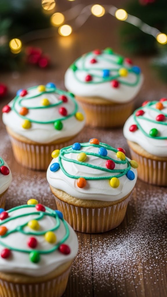 Frost cupcakes with white or green icing. Pipe a string of “lights” using black or brown icing, then add colorful M&Ms, chocolate candies, or fondant bulbs along the line. These cupcakes are vibrant, playful, and inspired by classic Christmas décor.