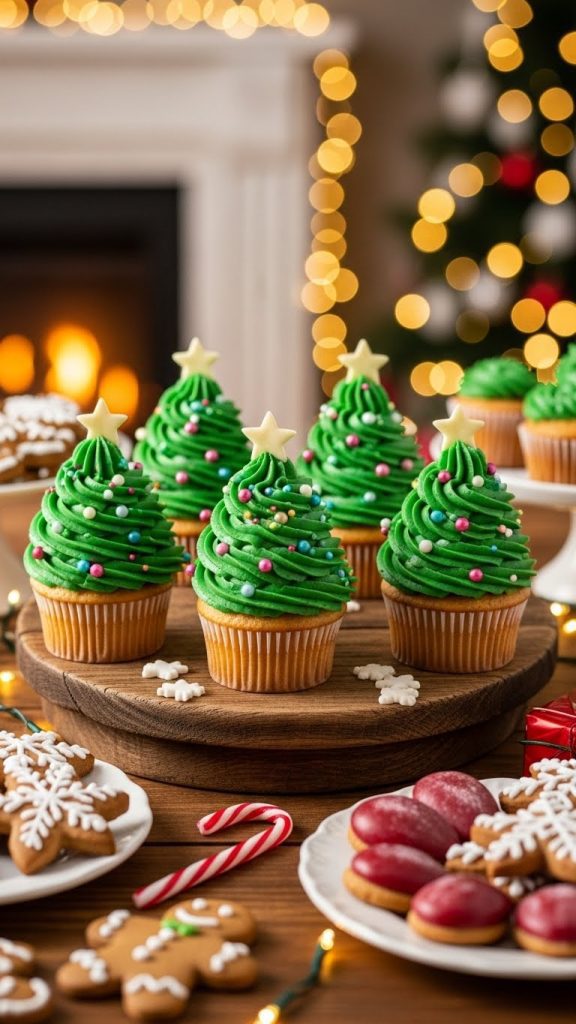 Pipe green buttercream in tall swirls to resemble a tree. Use a star piping tip for texture. Add mini sprinkle ornaments and top with a small fondant star. For a snowy effect, dust the cupcake base with powdered sugar or coconut flakes. These cupcakes look magical on a dessert table!