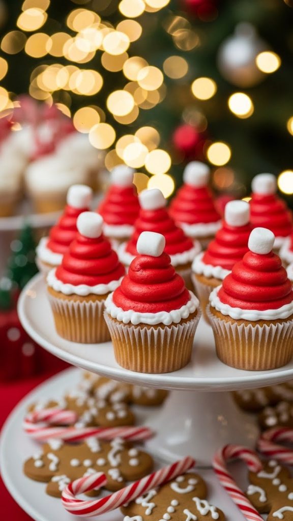 Chocolate cupcakes topped with swirls of whipped frosting, mini marshmallows, cocoa powder dusting, and a small candy cane. Add chocolate drizzle for richness. These cupcakes taste like a warm mug of hot chocolate in dessert form—perfect for cold December nights.