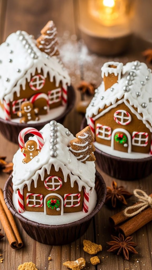 Use gingerbread-flavored cupcakes or decorate with mini gingerbread house toppers. Frost the cupcake base with white icing to look like snow. Add tiny gingerbread men or cookie pieces. A sprinkle of cinnamon sugar completes this cozy holiday design.