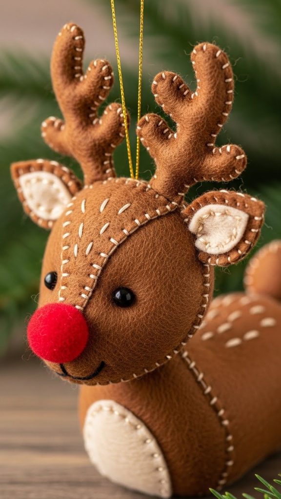 Cut two reindeer shapes from tan felt. Add embroidered eyes, a stitched nose, and black felt hooves. For Rudolph, add a red felt circle or bead nose. Attach antlers made from brown felt or pipe cleaners. Lightly stuff and stitch together. These reindeer bring adorable woodland magic to your tree.