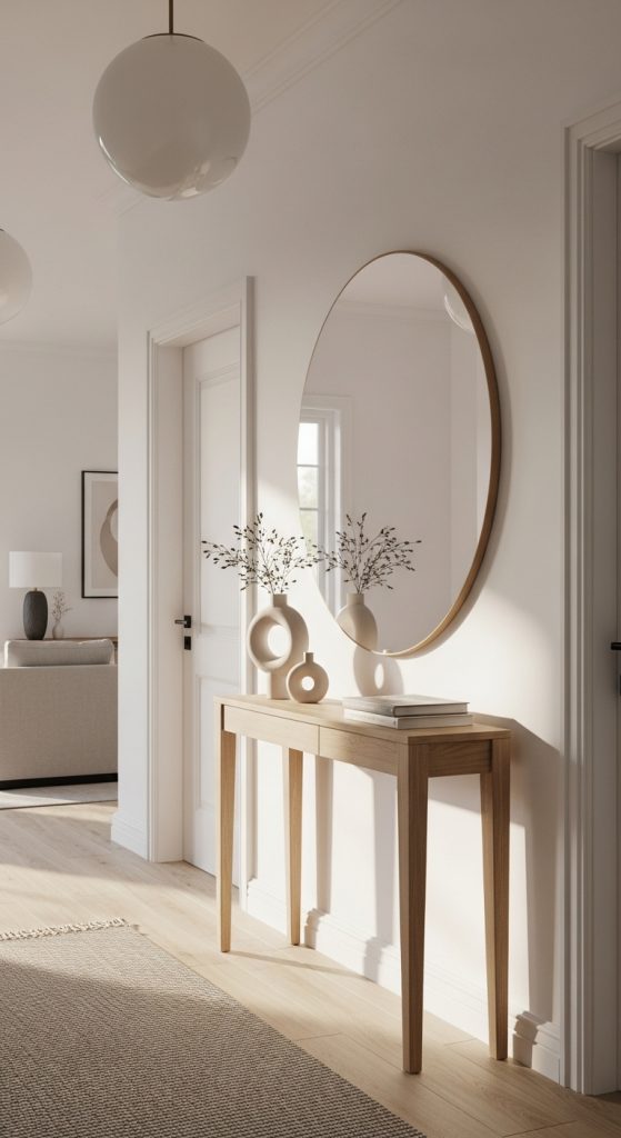 A single, well-placed mirror can do wonders for a minimalist hallway. It bounces light, visually expands the space, and adds a modern yet functional focal point. Choose a round mirror for softness or a tall rectangular one for a dramatic, architectural feel. Keep the frame simple — matte black, brass, or natural wood work beautifully in minimalist settings.