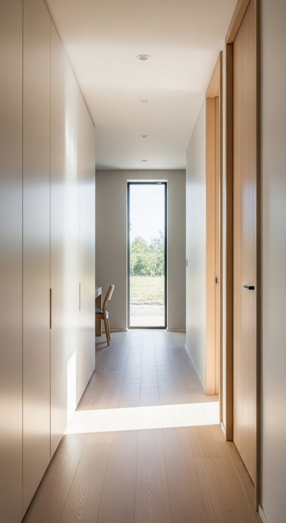 If your hallway has windows or transoms, make the most of them. Avoid heavy curtains and opt for sheer blinds or no window treatment at all. Natural light highlights the clean lines and natural materials of a minimalist hallway, making the space feel more open, fresh, and tranquil.