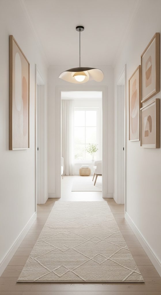 Introduce warmth underfoot with a slim runner rug in a neutral shade. Look for low-pile rugs in solid tones or subtle, linear patterns to match the minimalist vibe. This adds a layer of softness without disrupting the clean aesthetic and helps anchor the hallway visually.