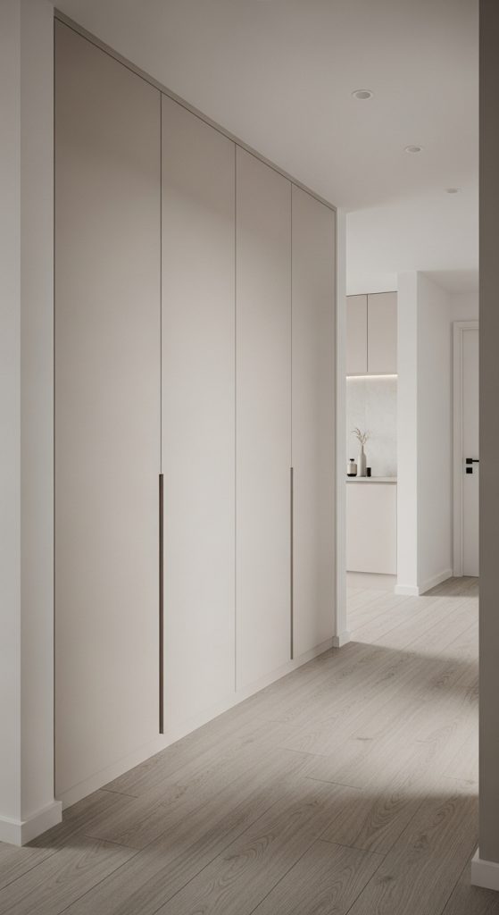 If you need storage, consider built-in options that blend seamlessly into the walls. Flush cabinets with push-to-open doors or recessed shelving keep clutter out of sight. Painted in the same color as the wall, these features add function without drawing attention.
