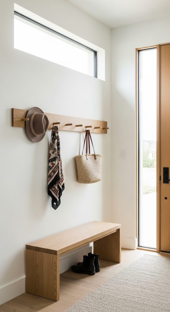 Instead of bulky furniture, install minimalist wall hooks or a wooden peg rail to hang everyday essentials like hats, bags, or coats. Choose uniform shapes and finishes — such as matte black metal, oak, or white — to maintain a streamlined look. This keeps things organized while doubling as understated wall decor.