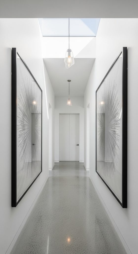 Less is more when it comes to hallway art. Select one or two large-scale prints or frames with simple, abstract designs, black-and-white photography, or calming natural imagery. Leave plenty of white space around them to preserve an open and uncluttered visual flow. Thin frames in black, white, or brass keep things cohesive.