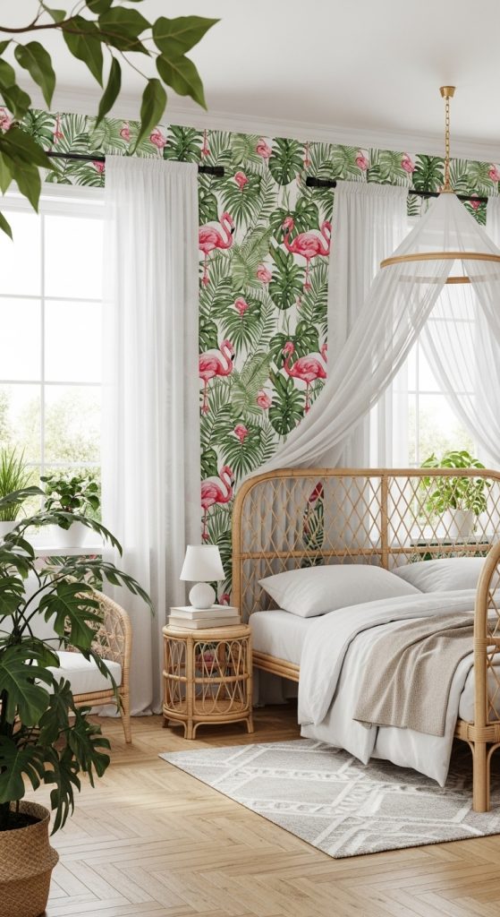 Palm leaves, flamingos, and tropical flowers will make your room feel like a vacation spot — no matter the season.