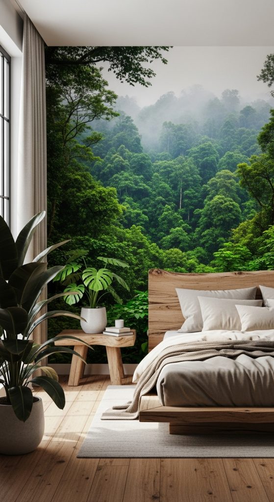 Wallpapers with large leaves, forest views, or mountain landscapes bring freshness and calmness to your space. Green and earthy tones are perfect for creating a relaxing mood.