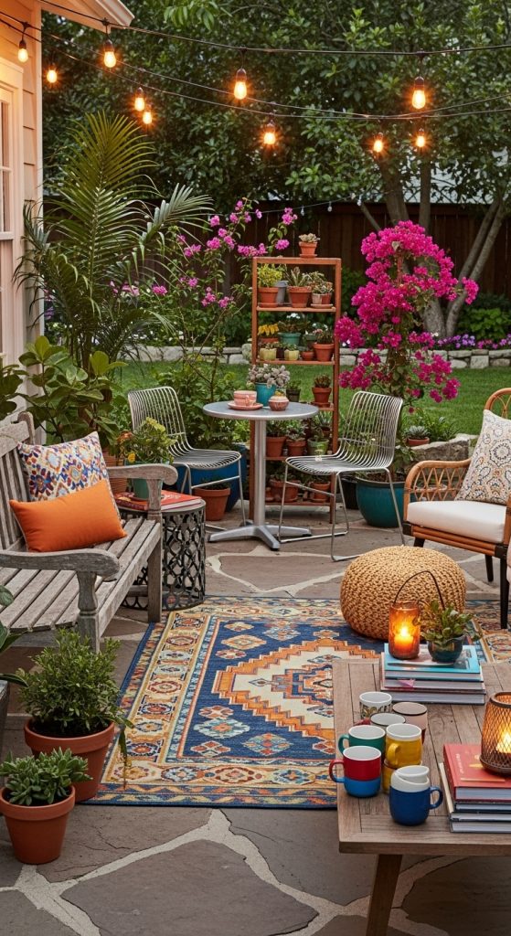 Combine metal, wood, and wicker pieces to create a layered, eclectic look. Throw in vibrant cushions and patterned rugs for personality and warmth.