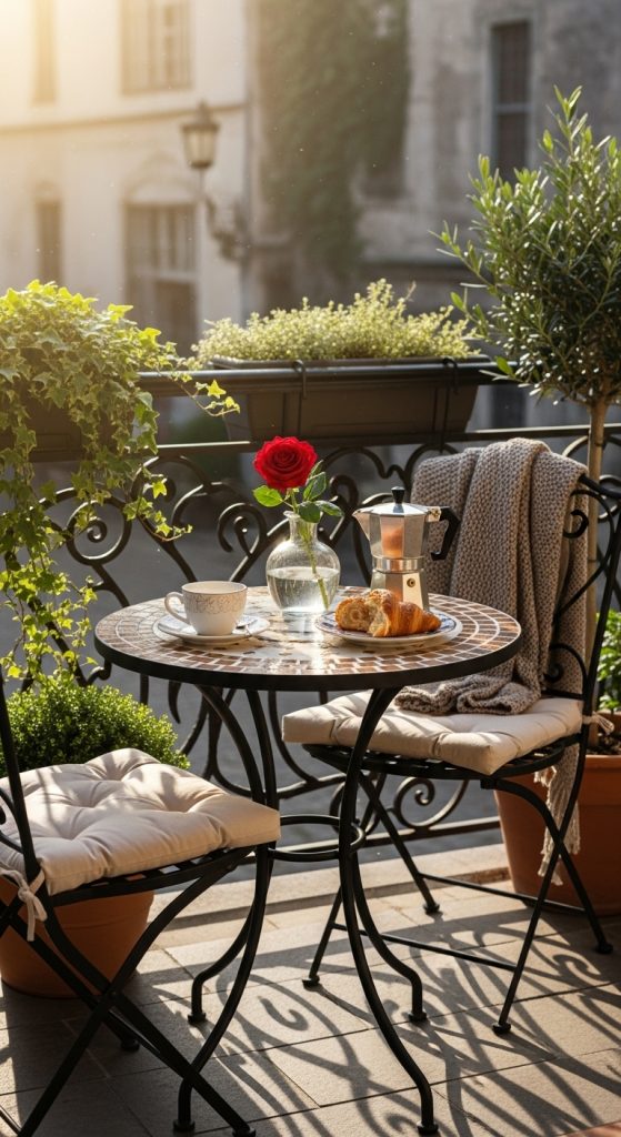 A small round table with two chairs works beautifully for intimate patios or balconies. Ideal for morning coffee or evening wine, it’s charming yet practical.
