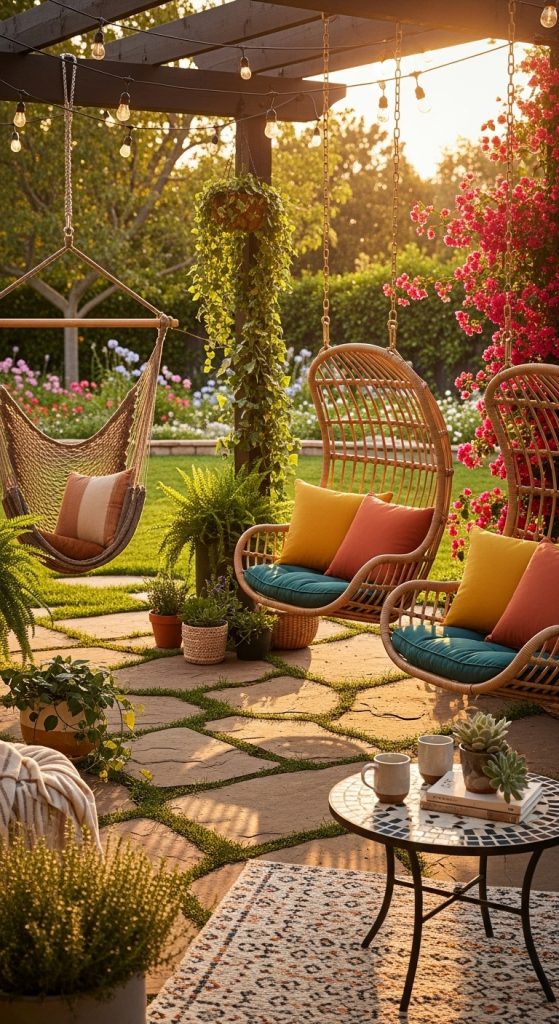Adding a hammock or hanging swing chairs gives your patio a playful and cozy vibe. Perfect for reading or afternoon naps in the fresh air.