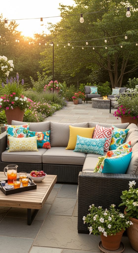 A large outdoor sectional creates a communal, relaxed atmosphere. Add colorful throw pillows and a low coffee table for a perfect entertaining space.