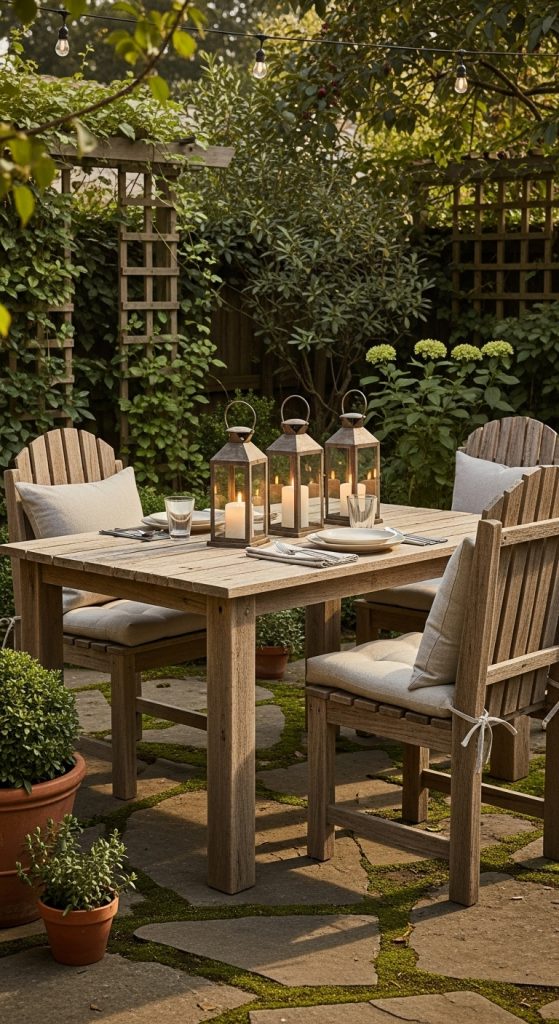 A natural wooden table and chairs set creates a warm, inviting look. Pair with soft cushions and a few lanterns to make your patio feel cozy and welcoming.