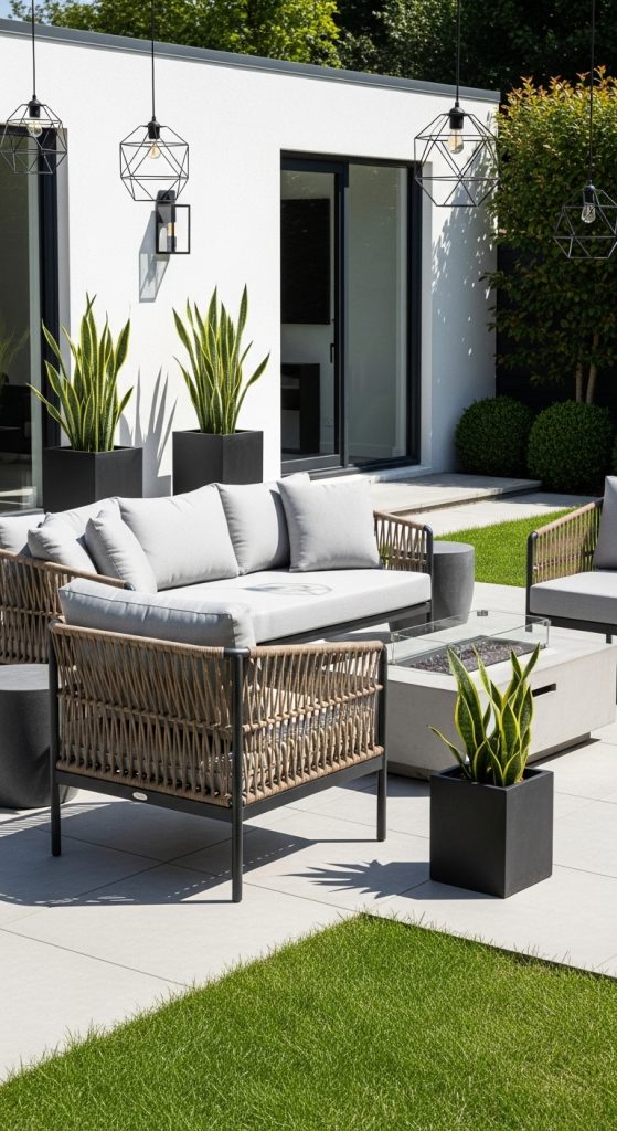 Opt for sleek metal or rattan furniture with neutral cushions. Keep décor minimal, adding only a few potted plants or geometric lanterns for a clean, contemporary look.