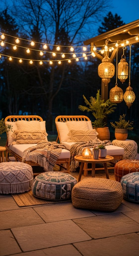 Low rattan chairs paired with poufs and floor cushions create a relaxed bohemian vibe. Add string lights or lanterns for a cozy evening setup.