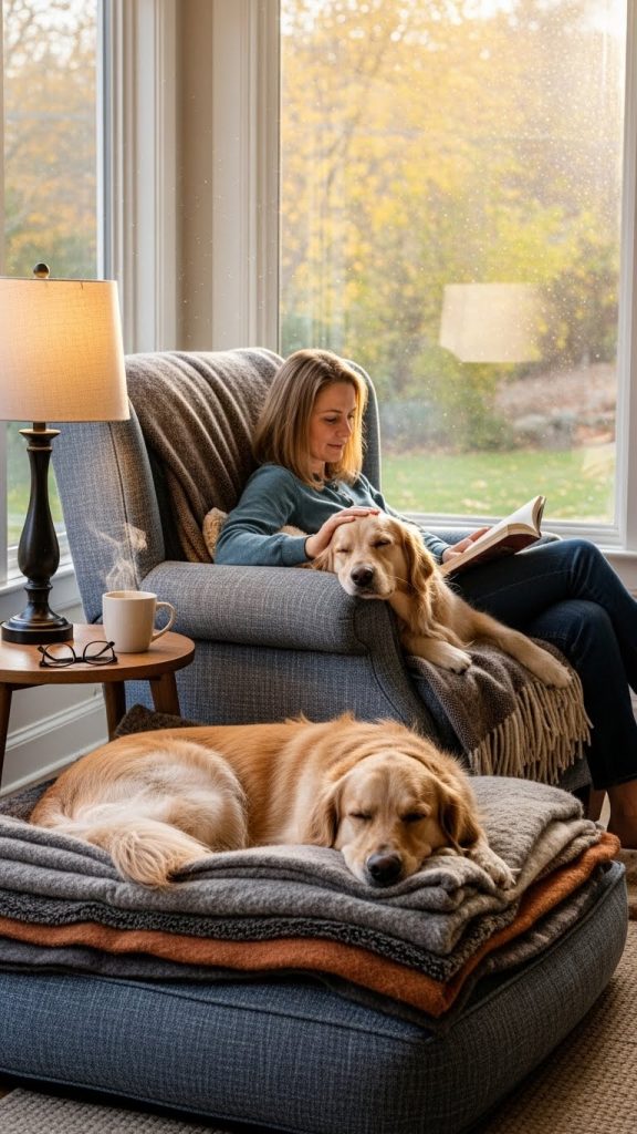 Blankets, cushions, and throws make the nook inviting. Ensure all textiles are washable to handle pet fur, drool, or accidents.