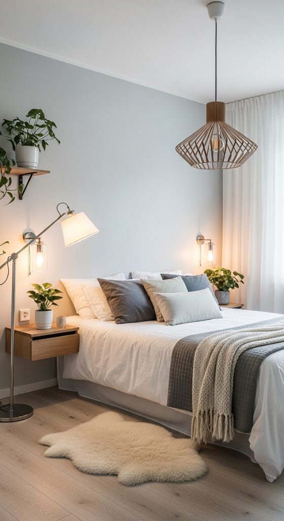 Pendant lights, simple floor lamps, or bedside sconces in metal, wood, or glass add a stylish focal point.