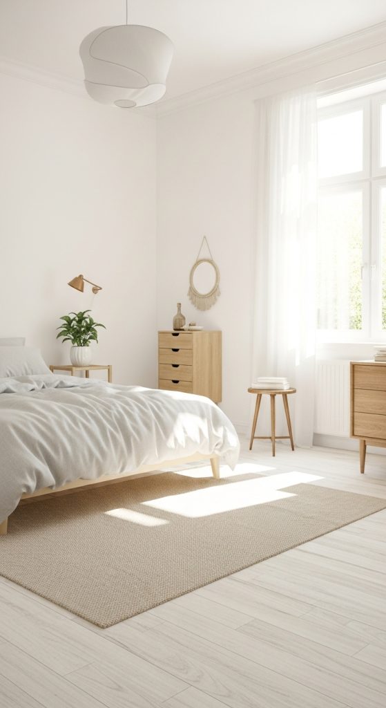Whites, soft greys, beige, and muted pastels set the foundation for a calm, Scandinavian-inspired bedroom.
