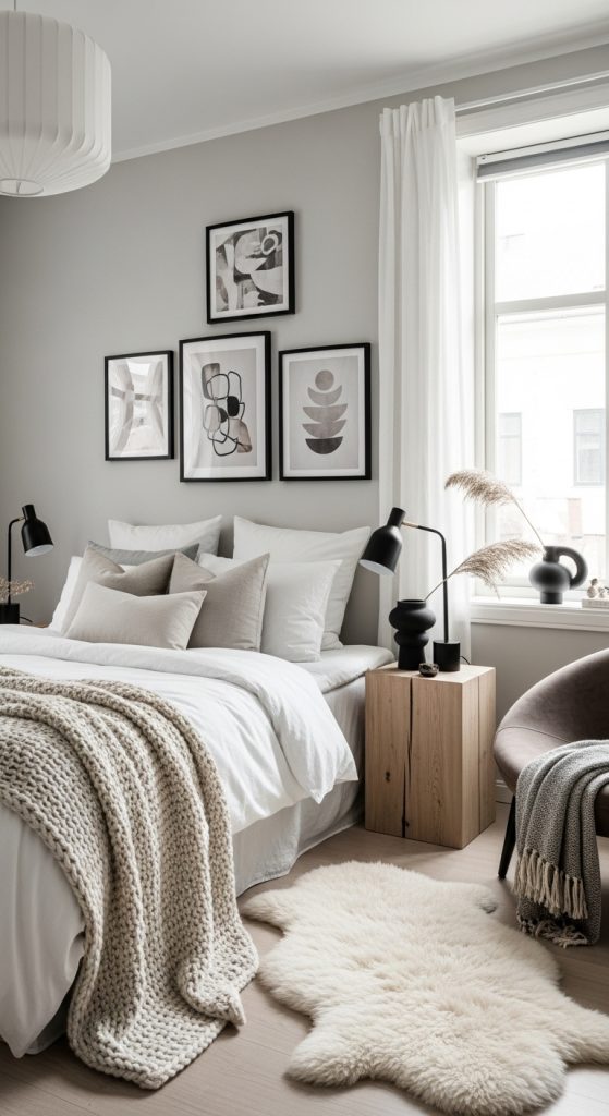 Balance soft neutrals with black frames, dark lamps, or bold statement accents for a modern Scandinavian touch.