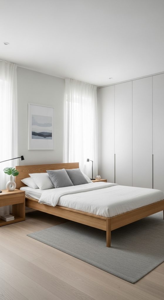 Choose furniture with clean lines and functionality. Think platform beds, wooden nightstands, and minimalist wardrobes.