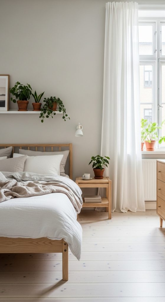 Scandinavian design values practicality. Opt for under-bed storage, wall shelves, or hidden drawers to keep the space clutter-free.