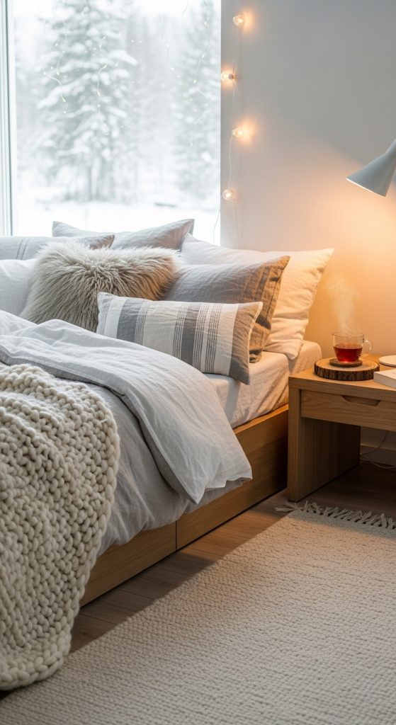Add warmth with chunky knit blankets, linen bedding, and soft wool rugs. These layers create a hygge-inspired, cozy vibe.