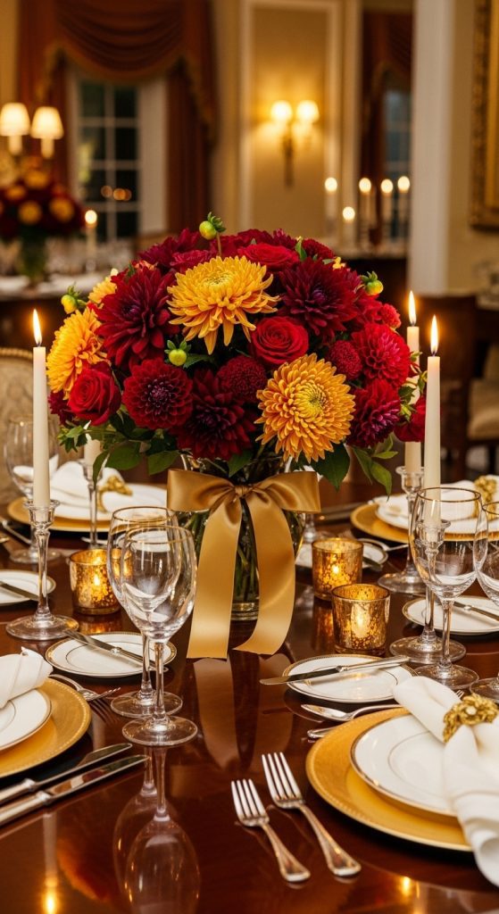 Create a sophisticated look by combining burgundy dahlias, red roses, golden chrysanthemums, and greenery. Arrange them in a glass vase with gold ribbon accents. This looks elegant in formal dining rooms.