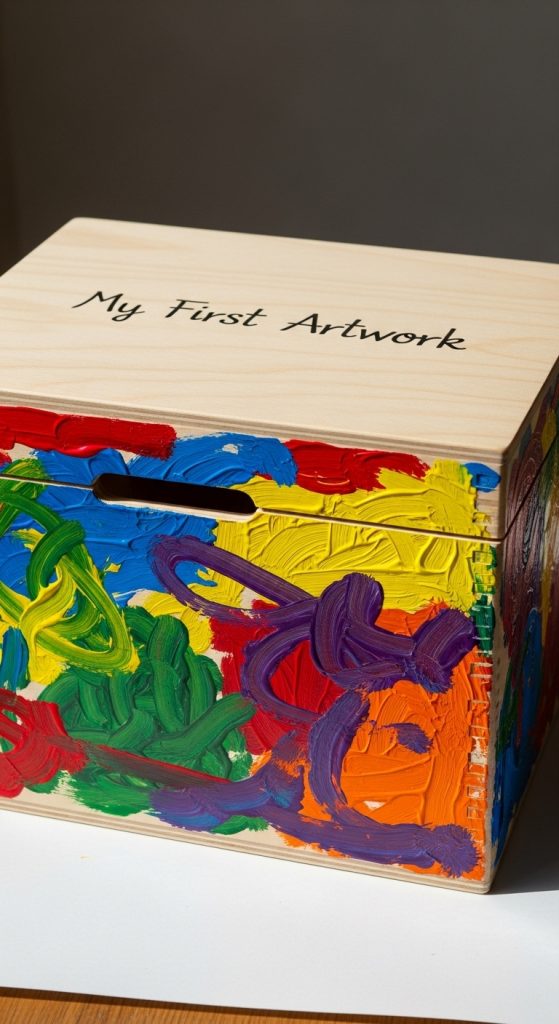 Line interior with acid-free paper to preserve contents. This box becomes a time capsule of early creativity that kids love revisiting as they grow.